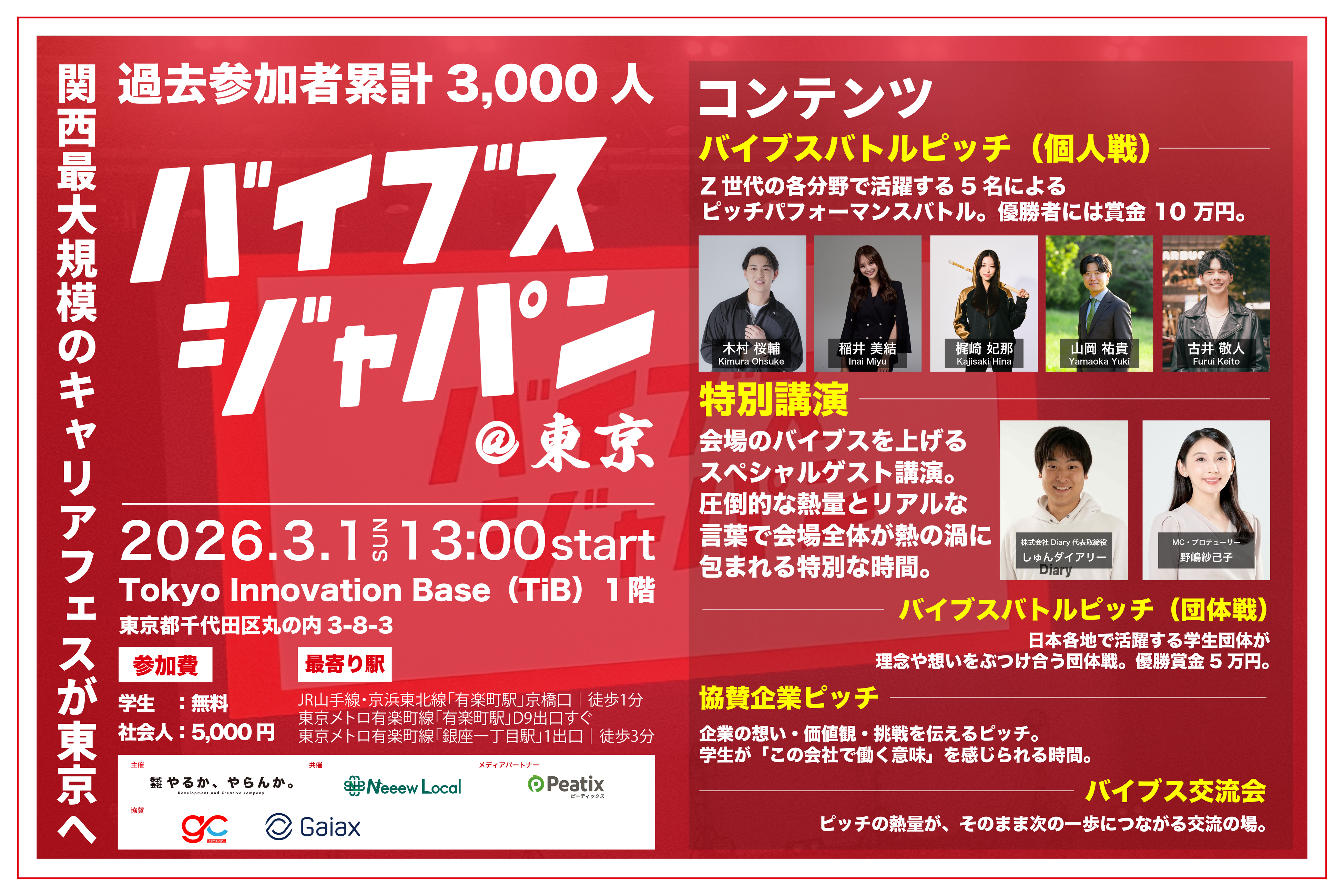 株式会社やるかやらんか(本社:奈良県橿原市、代表取締役:西奈槻)は、2026年3月1日(日)、Tokyo Innovation Base(TiB)にて、関西最大規模のキャリアフェス【バイブスジャパン】を東京初開催いたします。次の一歩を踏み出す若者を増やしたい。そんな想いから、関西で育まれてきたこの熱量を、東京へと届けます。