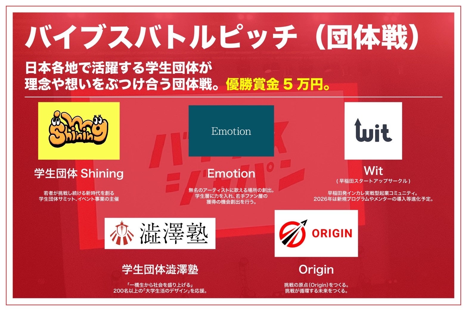 ■ バイブスバトルピッチ【学生団体戦】東京初企画。学生団体がチームとして登壇し、「どれだけ多くの仲間を巻き込み、熱量を生み出してきたか」をピッチ形式で競う団体戦です。活動実績や肩書きではなく、どんな想いを掲げ、どんな意思で仲間を集めてきたのか。団体としての価値観やストーリーを5分間で語ります。