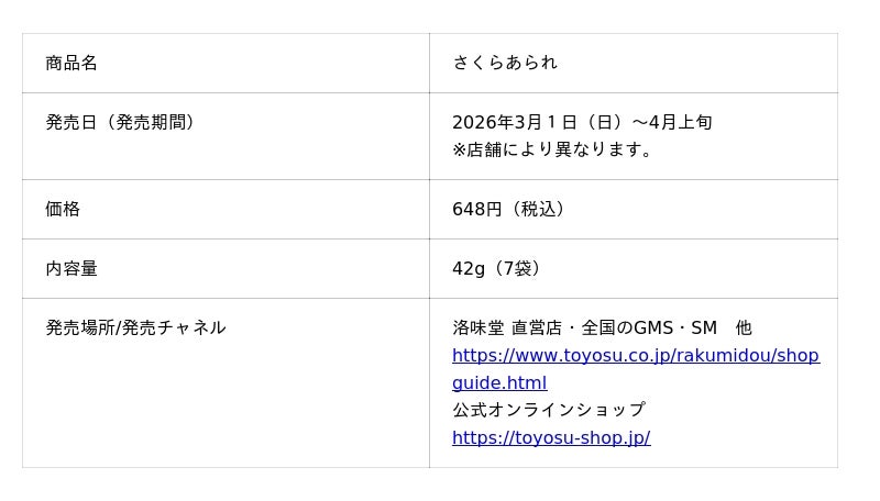 とよす株式会社(本社:大阪府池田市 社長:眞田 昌彦)は、とよす洛味堂『さくらあられ』を、2026年3月1日(日)から期間限定で発売いたします。