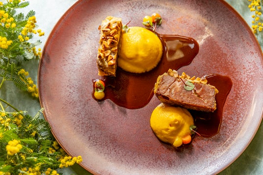 オージー・ラムのPR大使 「ラムバサダー」でもある宮島シェフが手がける珠玉の一品。大自然の中で健康的に育ったオージー・ラムの肩肉を、じっくりとコンフィ。香ばしく砕いたヘーゼルナッツをまとわせてベニエにすることで、ラム肉本来の旨みとナッツの芳醇な香りや食感を重ねた一品。ラムのすじ肉のお出汁をベースに程よい酸味を重ねたソースや、ミモザカラーをイメージしたニンジンのエスプーマとピクルスが軽やかなアクセントに。お肉のボリュームを楽しみながらもヘルシーで、不足しがちな栄養素も豊富な、女性に嬉しい一皿です。