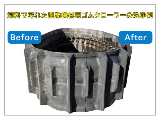 飼料で汚れた農業機械用ゴムクローラーの洗浄例