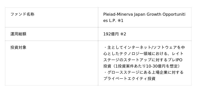 ※1 本ファンドは、金融商品取引法第63条に基づき適格機関投資家等特例業務に関する特例の適用を受けて、基本的にはいわゆるプロ投資家を相手に運営されるファンドです。本プレスリリースは、適格機関投資家及びファンドの投資先候補となる企業の皆様への情報提供を目的として作成されたものであり、金融商品取引法に基づく開示資料ではなく、また、本ファンドへの買付けの申込みを勧誘・推奨するものではありません。