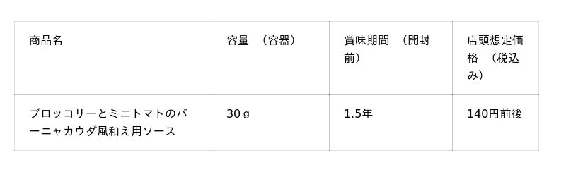 新発売の「ブロッコリーとミニトマトのバーニャカウダ風和え用ソース」は、注目度が高まっている素材であるブロッコリーとミニトマトの組み合わせに着目し、手軽にバーニャカウダ風の味わいを楽しめる商品です。最大の特徴は、”温めても、おいしい”点にあり、温野菜や蒸し野菜との相性がよく、おすすめの一品に仕上がります。