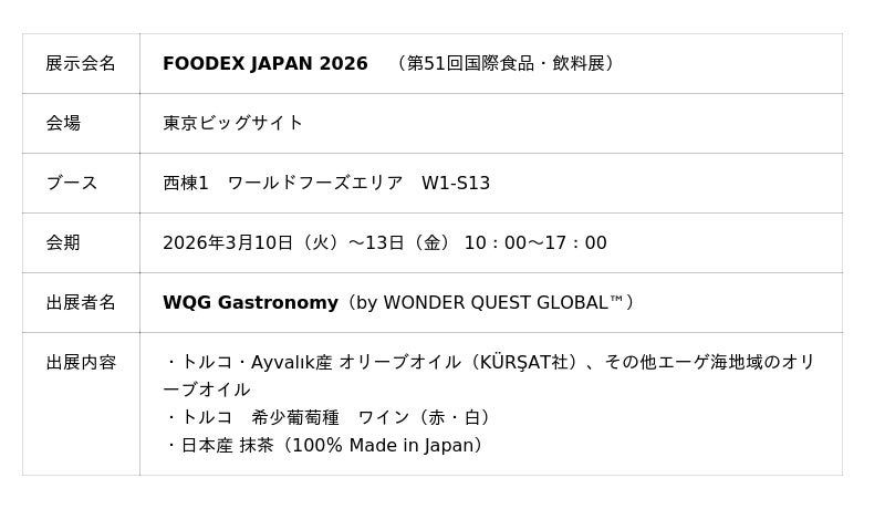 合同会社ワンダークエストグローバル(本社:東京都目黒区・海外本社:トルコ・イスタンブール、代表:川原優子、以下WQG)は、美食事業ブランド 「WQG Gastronomy」 として、2026年3月10日から13日まで開催の FOODEX JAPAN 2026(第51回国際食品・飲料展) に出展いたします。(ブース:西棟1 S-13 ワールドフーズエリア)