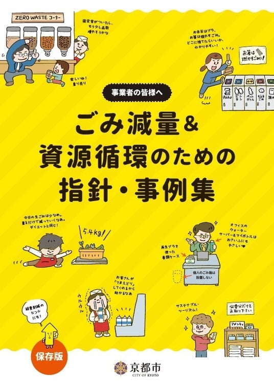 京都市の「ごみ減量&資源循環のための指針・事例集」は、食品ロスや使い捨てプラスチックごみ等の事業ごみの減量と資源循環を進めるため、京都市内で実践されている具体的な事例をまとめたものです。