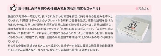 取り組みや事例は、小売業や飲食業、宿泊業などの業種別に、各事業所の取り組み状況に合った工夫を見つけ、事業活動に役立てられるよう、基本的な取り組みから一歩進んだ取り組み、先進的な取り組みまできめ細かく紹介されています。この中で、和食さとでは食べきれなかった料理を持ち帰って食べきることができる、食品ロス削減アクション「mottECO(モッテコ)」を導入していることが掲載されました。