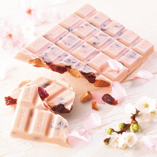 まろやかなホワイトチョコレートに、ストロベリーパウダーと桜の葉の味わいを加え、ドライチェリーとアーモンドを散りばめました。桜の香りや甘酸っぱい果実味、アーモンドの香ばしさが重なって広がる、表情豊かな春色の板チョコレートです。
