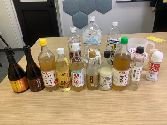 社内イベントでは、酢酸菌やにごり酢に関する基礎情報の共有に加え、複数種類のにごり酢を実際に試しながら、それぞれの味わいや取り入れ方を体験する機会を設けました。にごり酢は、一般的な濾過酢とは異なり、製造過程で生じる「澱(おり)」を含むことが特徴で、この部分に酢酸菌や菌体成分が含まれています。