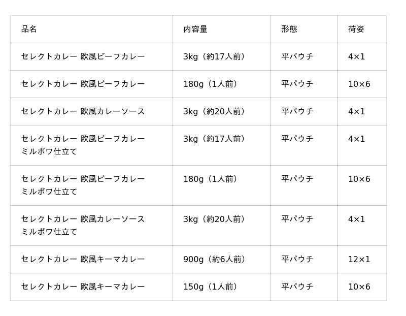 ミルポワ仕立て」「セレクトカレー 欧風カレーソース ミルポワ仕立て」「セレクトカレー 欧風キーマ