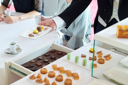 コースは、キャビアや極上黒毛和牛を使用した逸品をはじめ、デザートには目の前で仕上げるクレープシュゼットを。甘く芳醇な香りと迫力ある演出が華やかなひとときを彩ります。さらに、パティシエ特製のカヌレやフィナンシェなど約15種のフランス菓子がワゴンで登場。ご希望のメッセージを添えたデザートプレートや、お土産にはチョコレートでできた見た目もそっくりの「祝鯛」をご用意し、特別な一日の余韻をお持ち帰りいただけます。