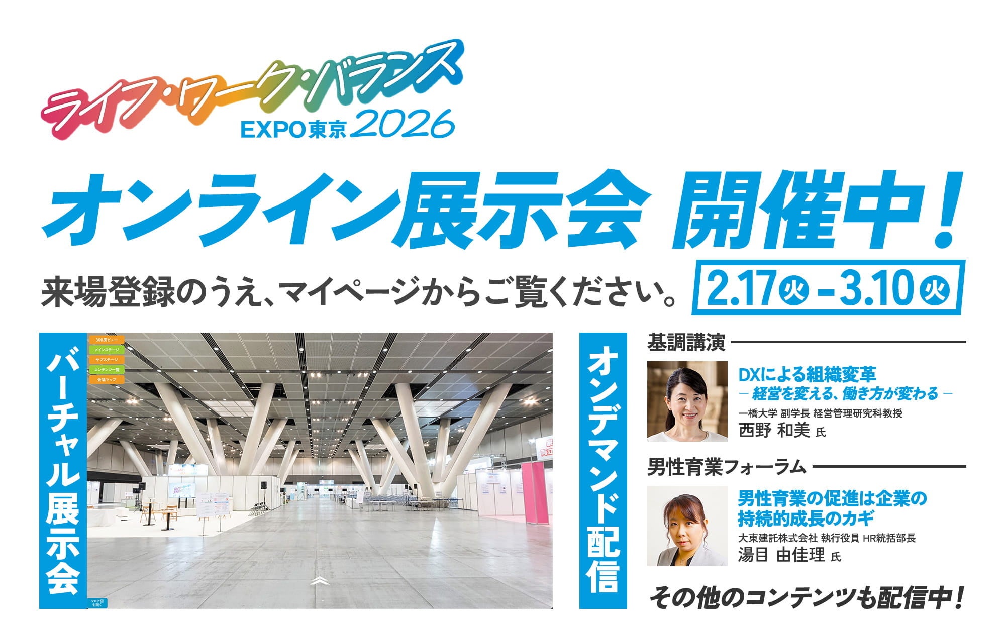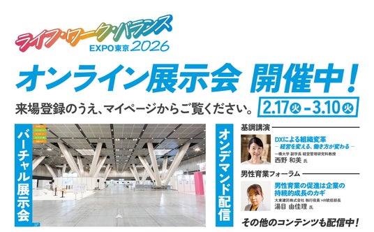 本日より開催の「オンライン展示会」では、当日のステージ講演をオンデマンド配信でご覧いただけるほか、360°バーチャル空間上で当日の会場内展示を体感・周遊いただけます。