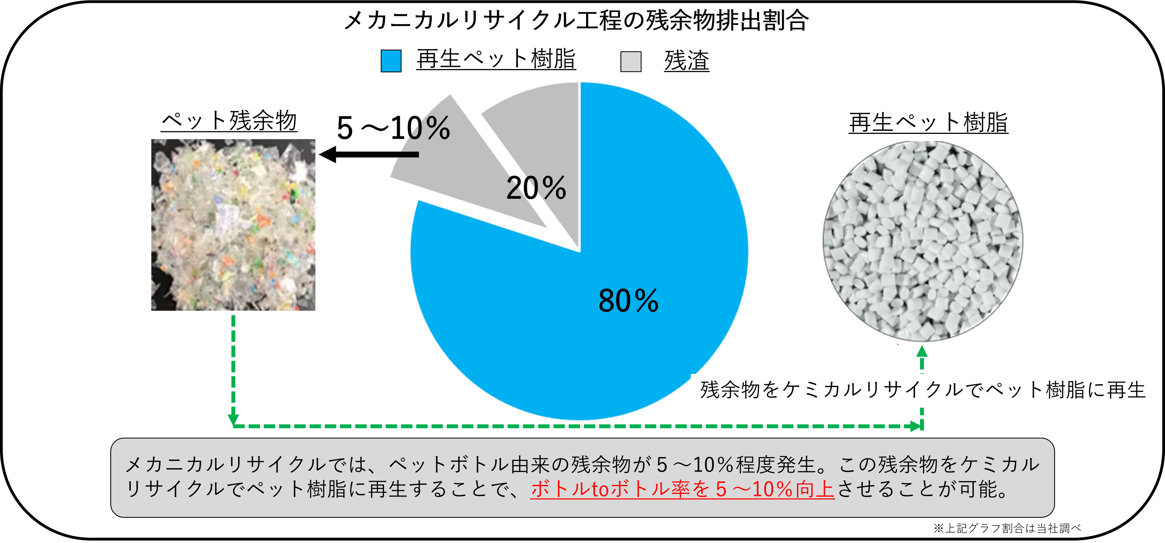 メカニカルリサイクルではリサイクルの工程で約20%の残渣が発生しますが、そのうち5~10%の残余物はペットボトル以外のものへのリサイクルが主となっています。残余物の一部にはペットボトル素材が含まれているため、残余物もペットボトル原料に再生することで、効率的かつ持続的なリサイクルが実現できます。