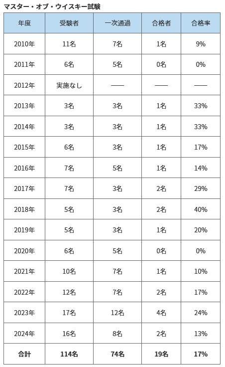 「マスター・オブ・ウイスキー」試験は、ウイスキーに関するあらゆる知識、鑑定能力を問うウイスキーコニサー資格認定制度の最終段階で、最も難易度の高い試験です。2010年から今年で15回目(※)を迎え、これまででわずか19名が合格しています。