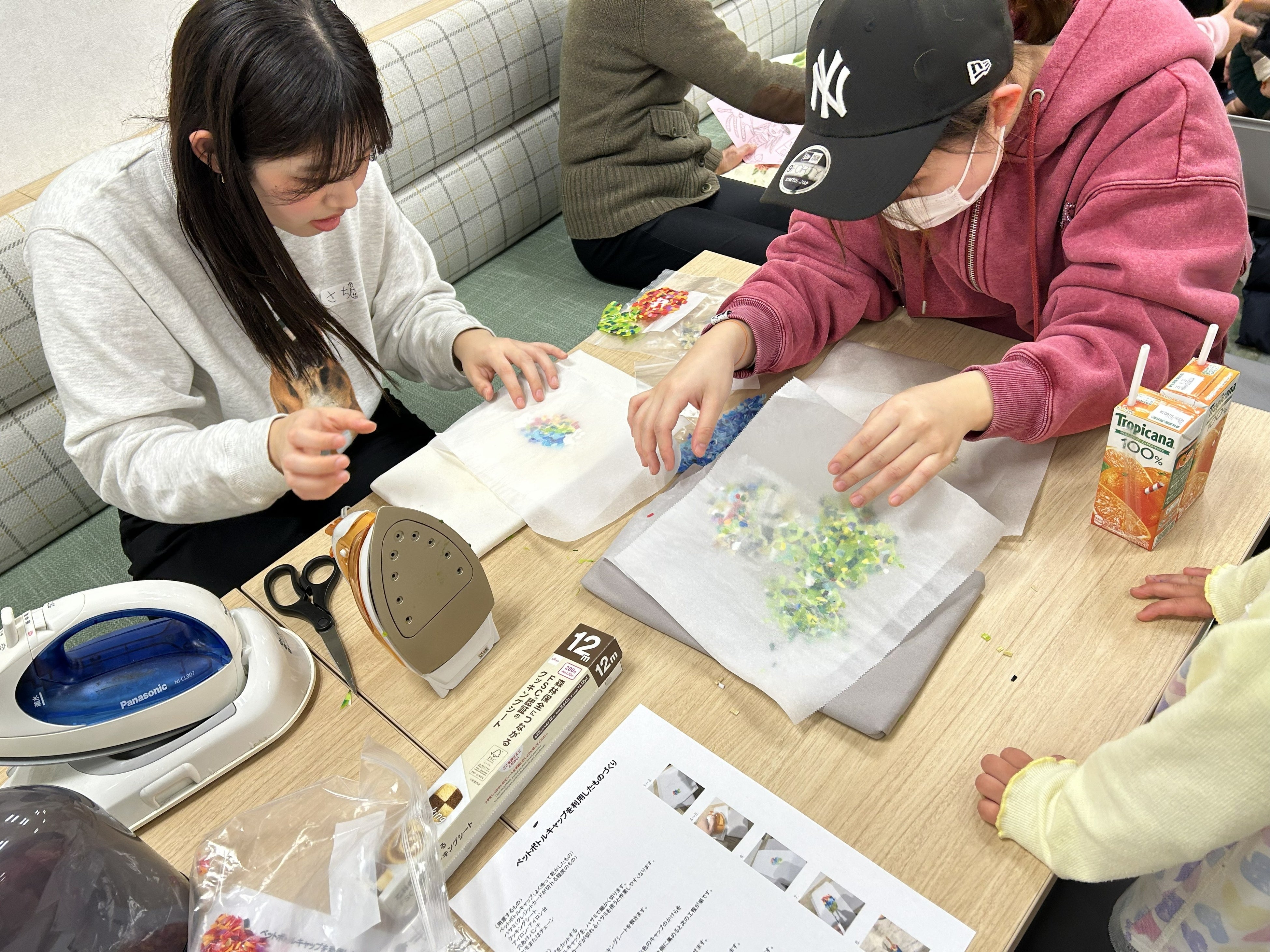 並べたペットボトルキャップにアイロンを当てて、仕上がりが楽しみ
