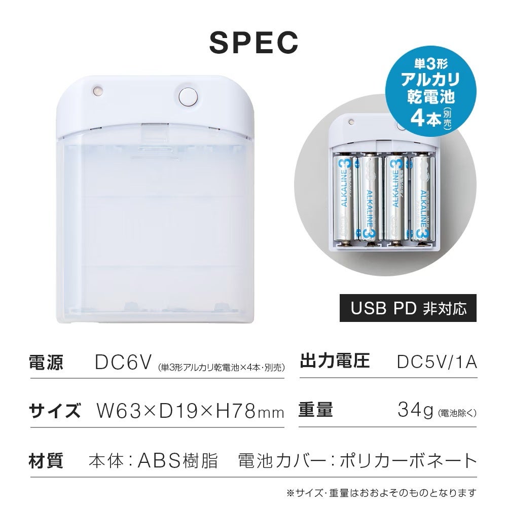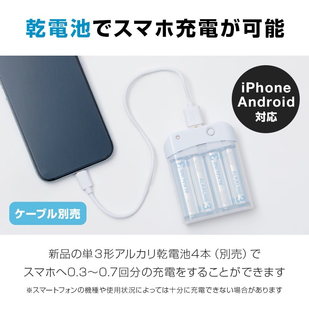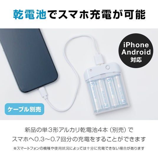 ・単3形アルカリ乾電池4本で、スマートフォン0.3~0.7回分の充電が可能です。