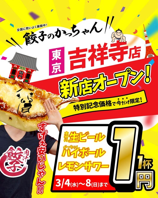 株式会社double(本社:大阪府大阪市北区/代表取締役:松井 勝也)は、2026年3月4日(水)に「肉汁製作所 餃子のかっちゃん 吉祥寺店」をオープンいたします。オープン記念として、3月4日から3月8日の5日間終日、生ビール/ハイボール/レモンサワーが1杯1円のキャンペーンを開催します。(https://www.instagram.com/p/DTKY4U_CZZG/)