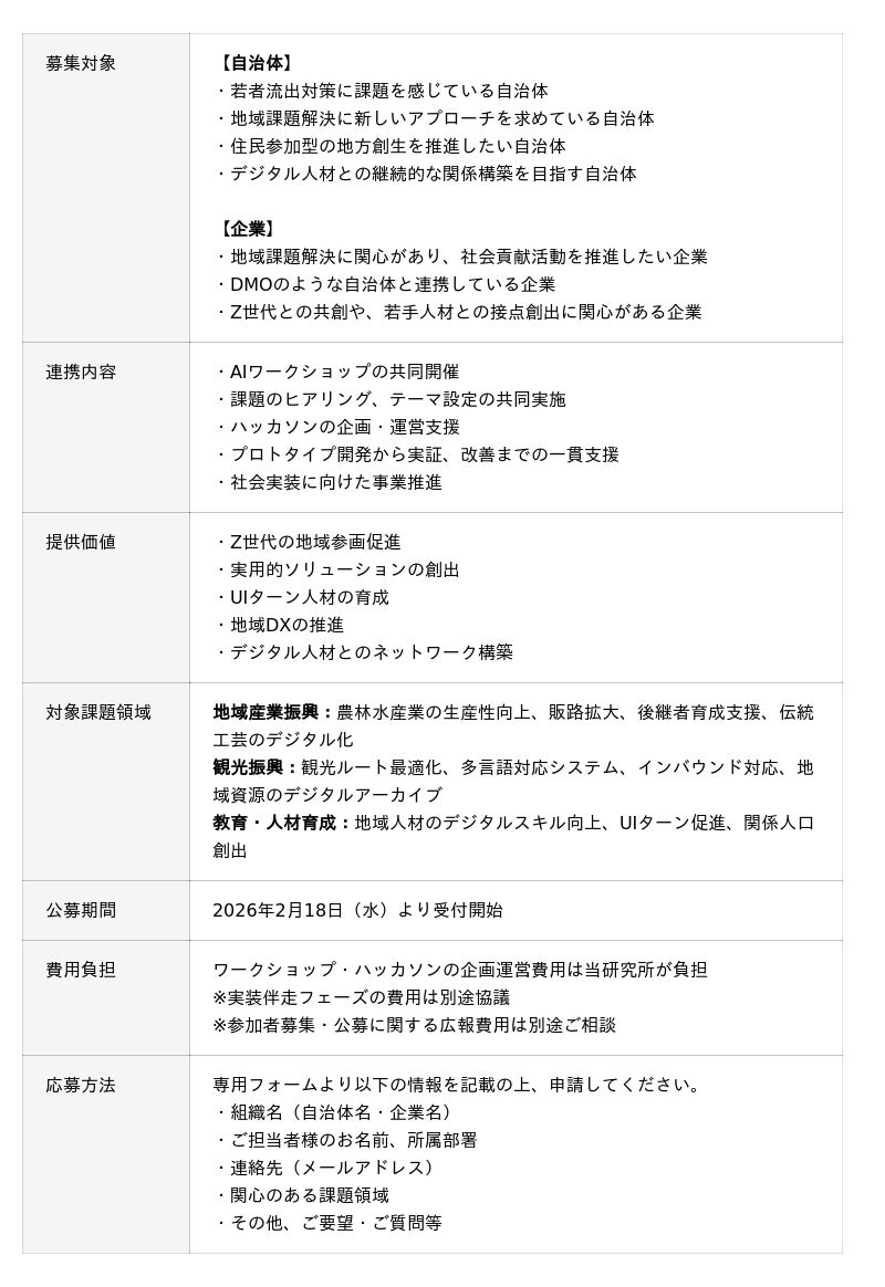 当研究所は、地域課題解決に取り組む自治体・企業との連携を開始します。「作って終わらせない」社会実装モデルを共に実現し、新たな地方創生の形を創出するパートナーを募集します。