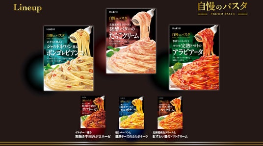 『自慢のパスタ』シリーズは「ちょっと贅沢なこだわり」をテーマに、厳選した素材とこだわりの製法で仕上げたパスタソースです。既存の3品に加え、「あさりの旨みとシャルドネワイン薫るボンゴレビアンコ」「北海道産生クリームと発酵バターのたらこクリーム」「香ばしにんにくとイタリア産完熟トマトのアラビアータ」の3品が新たに仲間入りし、計6種類のラインナップで幅広いニーズにお応えします。