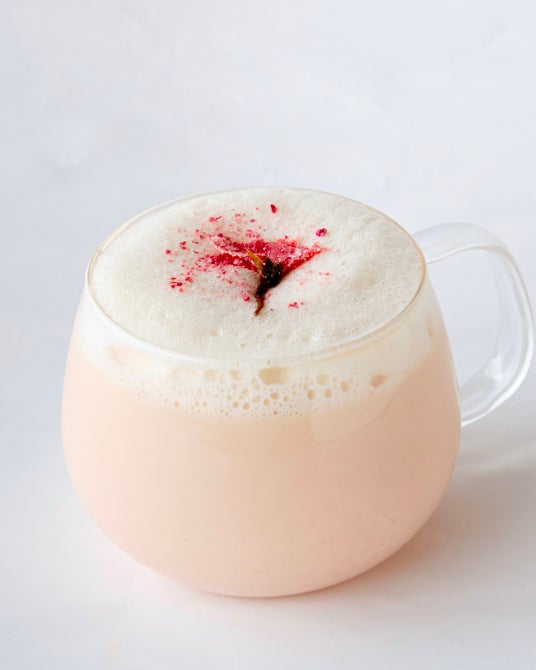 ベースには、自然なピンクが美しい「さくらの香りのあまざけ さくらもち」を使用し、その上にふんわり泡立てた豆乳フォームを重ねた、春限定ラテ。