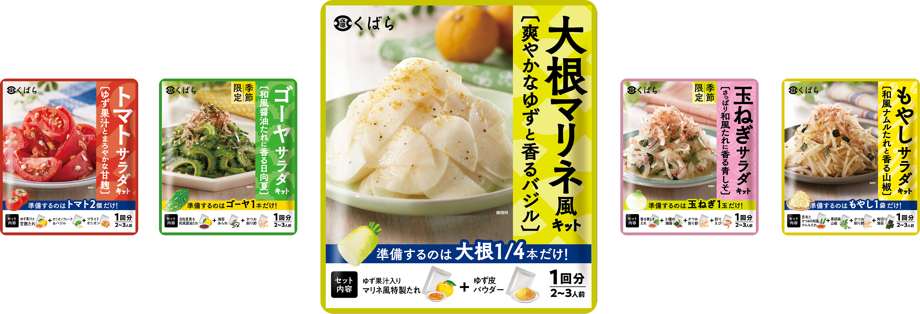 この度、節目の年を迎えるにあたり、定番野菜である“大根”を主役にした『大根マリネ風キット』を新たにラインナップに加え、『選びやすさ』をコンセプトに全商品のパッケージデザインをリニューアルいたします。