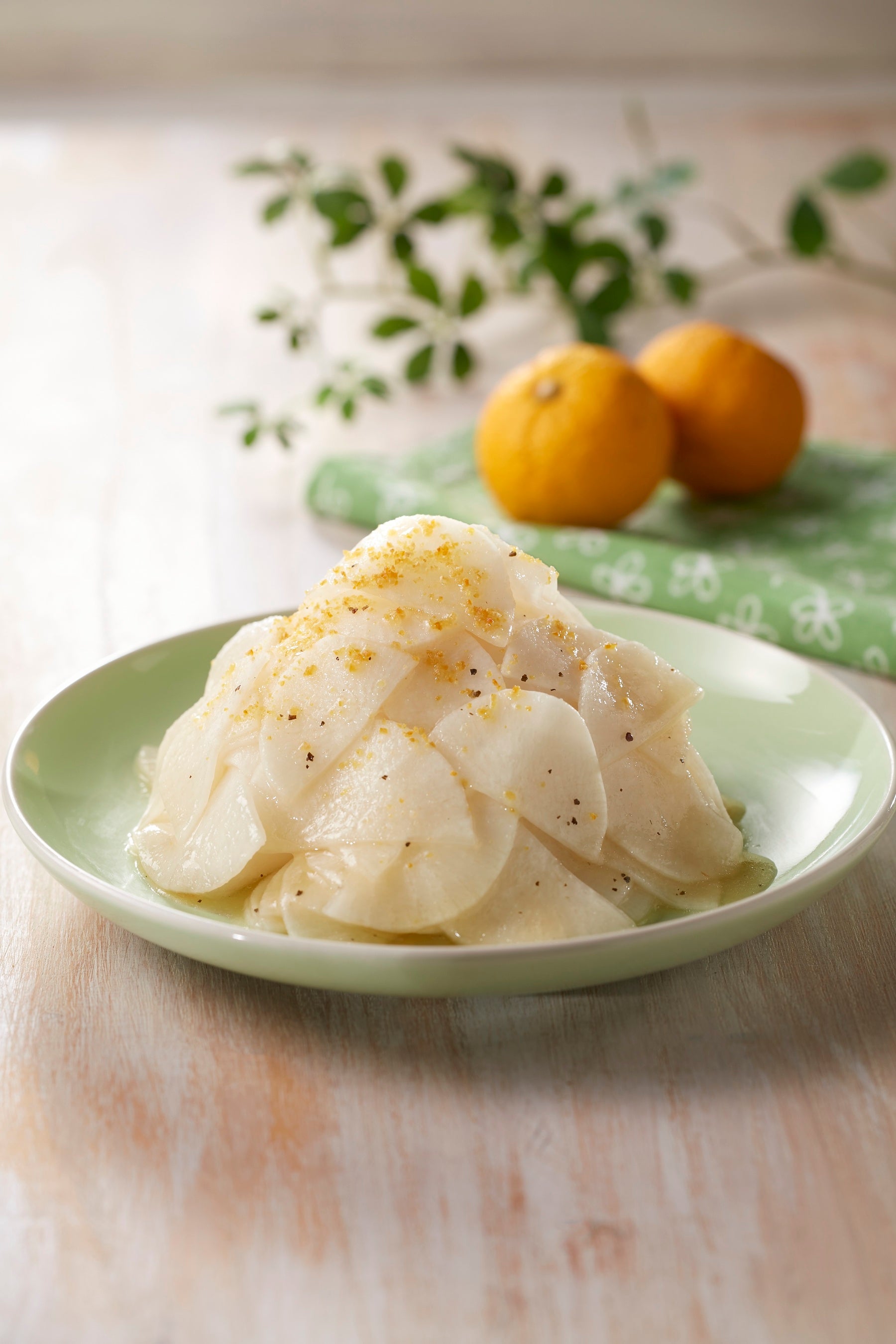 水分量の多い大根は、和えてなじませる調理法と相性抜群です。淡白な大根に、ゆずの爽やかな香りとバジルの風味が広がり、あとを引く美味しさに仕上げました。和洋を問わず、食卓の箸休めとしても最適です。