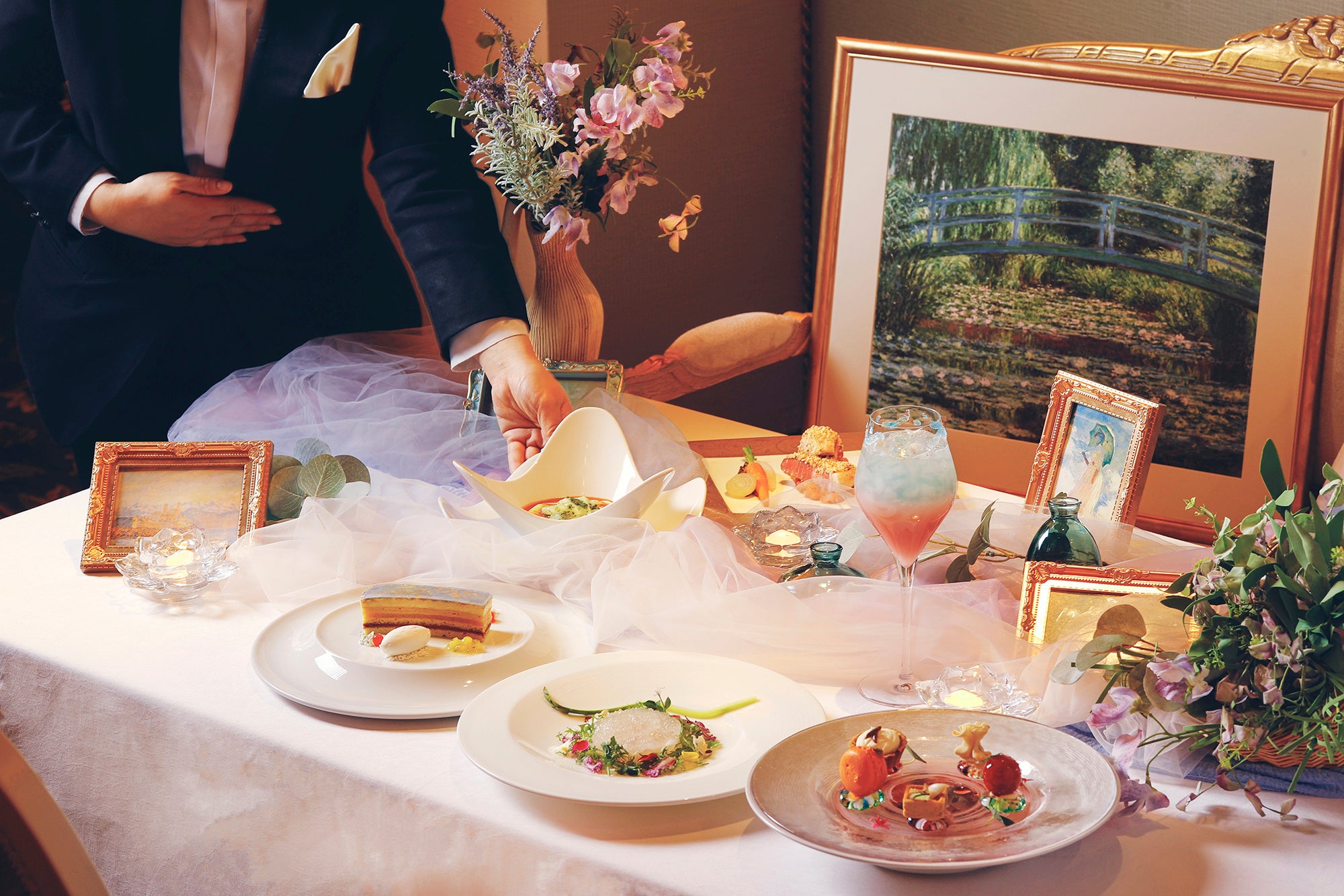 ジヴェルニーの庭をイメージした装飾席で味わう、印象派をモチーフにした特別コース
