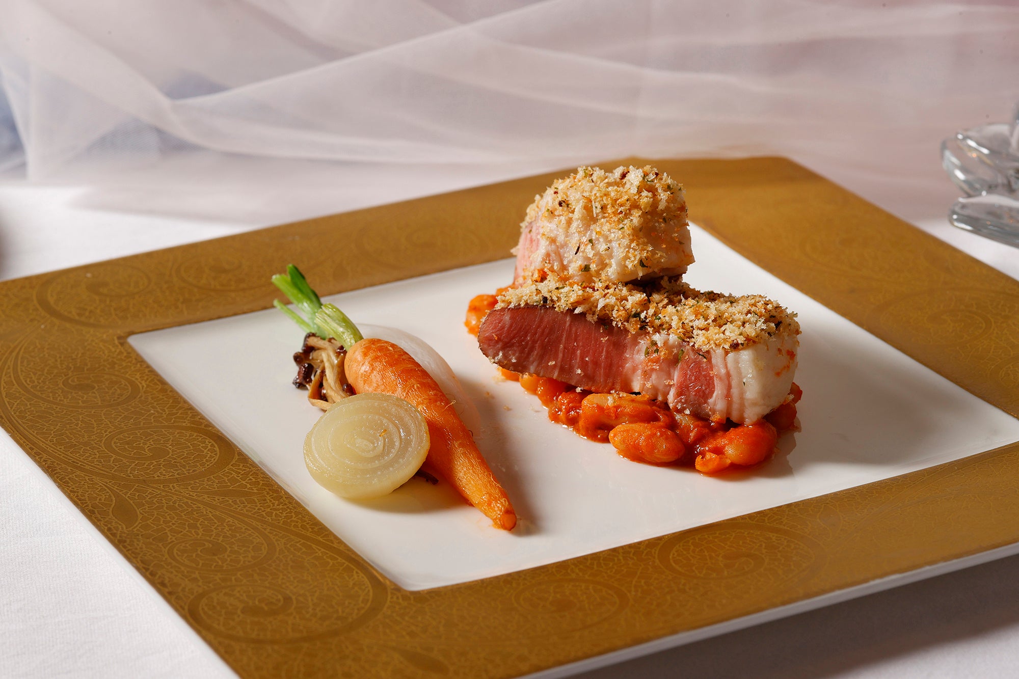 メインディッシュは、「ジヴェルニーの積みわら」の温もりある色彩から想いを広げ、フランス伝統料理カスレのエッセンスを織り込んだ、北海道産豚肩ロース肉のポワレをご提供します。