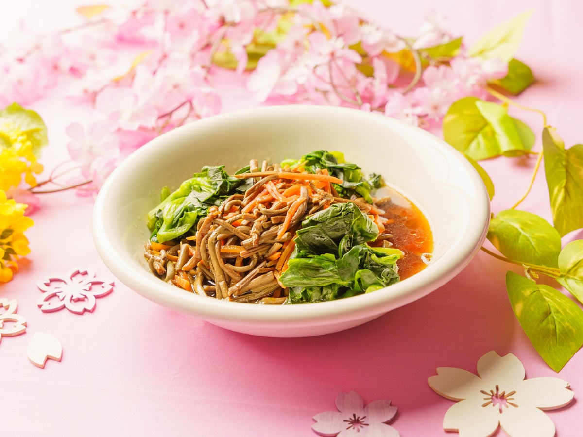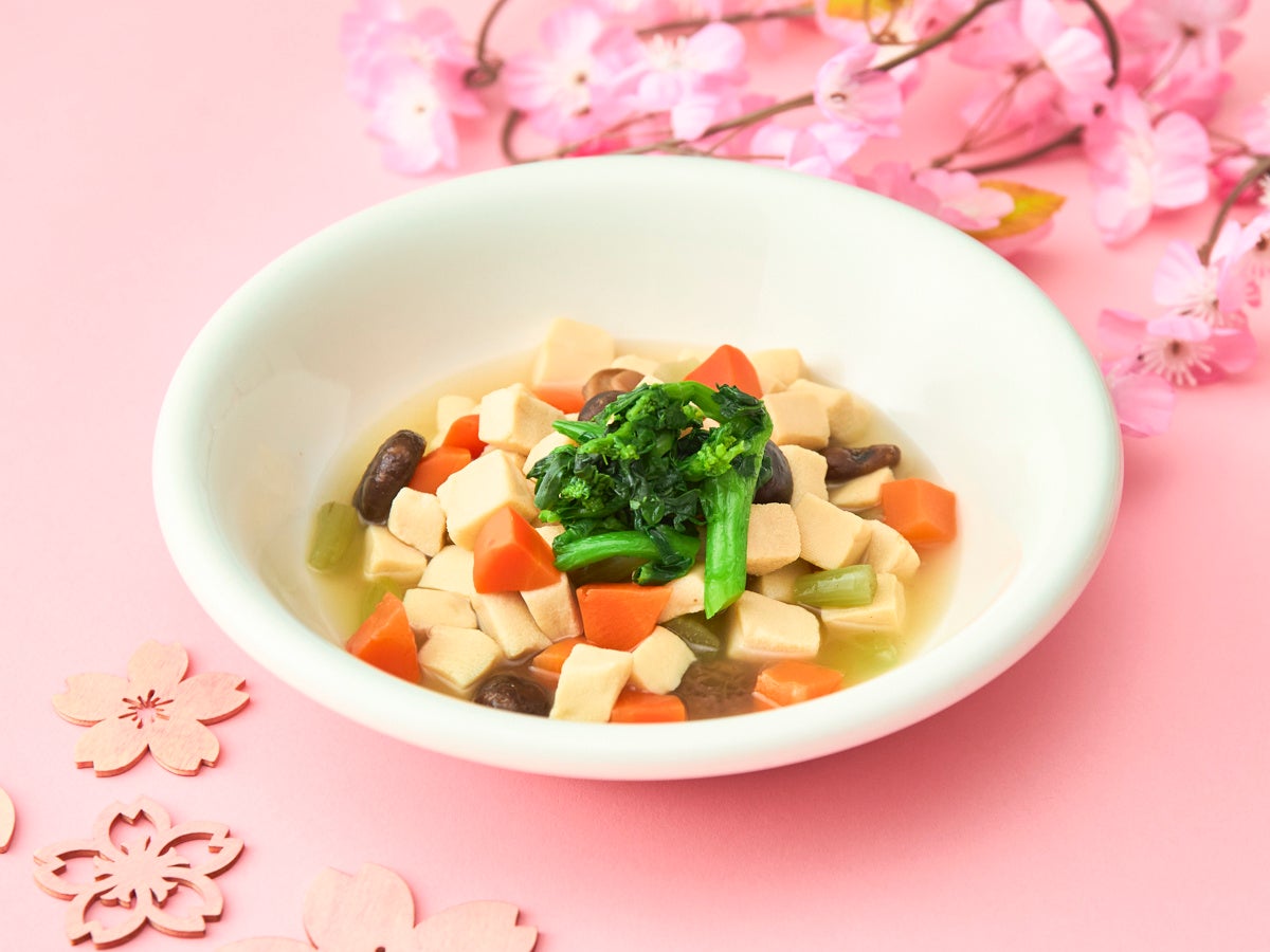 2026年春の朝食は「春野菜や香り豊かな食材を使った、やさしい味わいのモーニングビュッフェ」をテーマに、旬の春野菜を彩り豊かに盛り付けた「彩り高野豆腐春野菜添え」や、菜の花を使用した「菜の花とマカロニ玉子サラダ」、春らしい暖かさを感じる「オニオンスープ」など、春を感じるおかずや惣菜、サラダ、スープなど多彩なメニューをご用意しました。