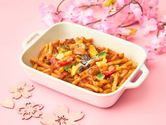 (右)ミートソースに彩り野菜を加え、トマトの風味を活かした【彩り野菜のマカロニボロネーゼ】(日替わり)