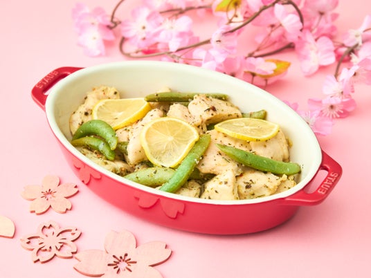 (右)若鶏にレモンとバジルの風味を取り入れ、春らしい香りを楽しめます【若鶏のレモンバジルグリル】(日替わり)