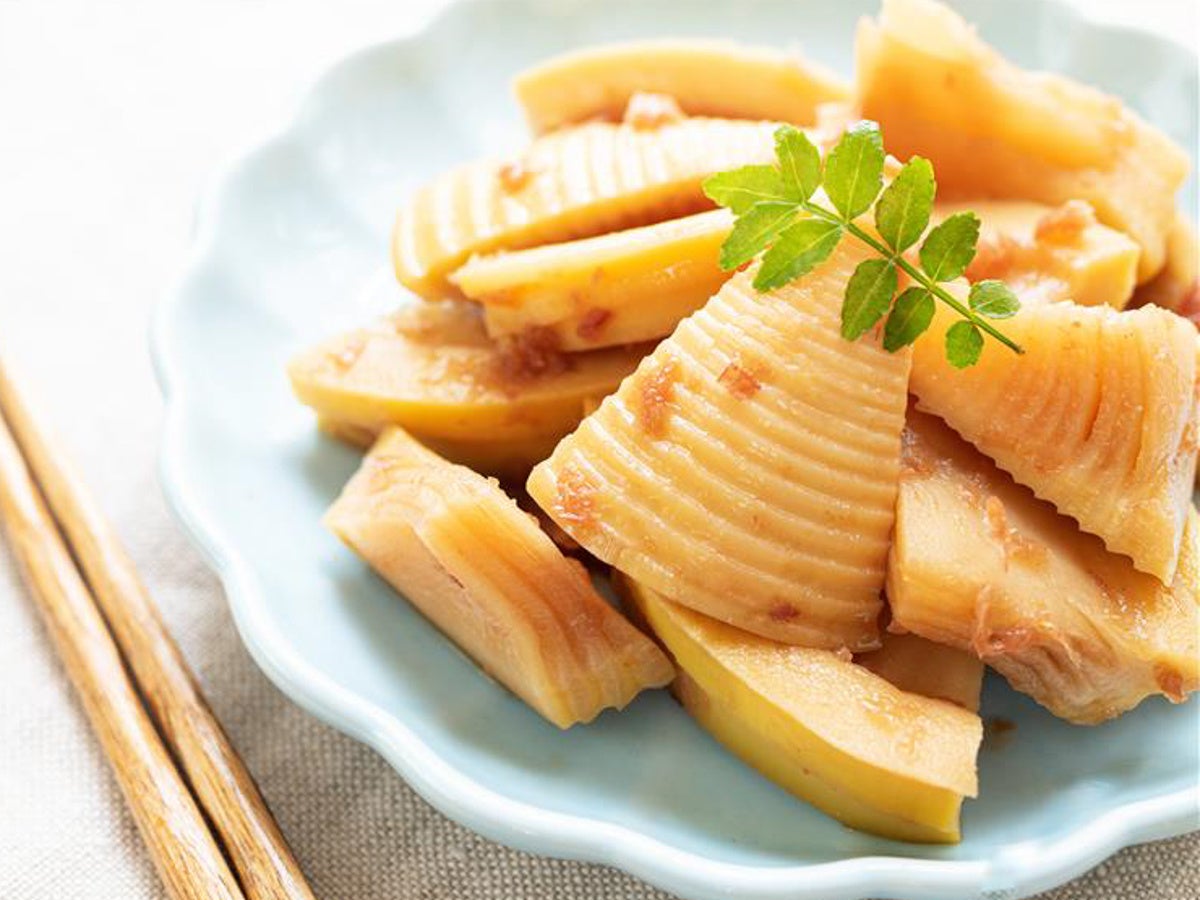(右)たけのこの旨味を出汁の風味を活かして仕上げた、やさしい味わいの一品【たけのこの土佐煮】(日替わり)