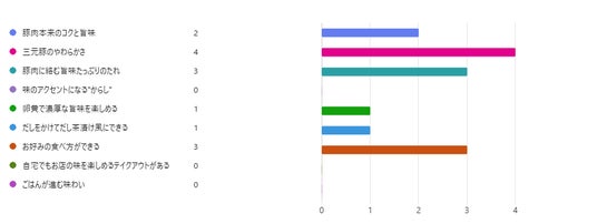 最も多くの票を集めたのは「三元豚のやわらかさ」でした。続いて「豚肉に絡む旨味たっぷりのたれ」、「お好みの食べ方ができる」が同率2位という結果となりました。