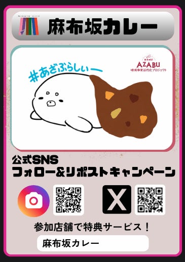 麻布地区地域事業活性化プロジェクトの公式InstagramおよびX(旧Twitter)をフォローし、指定投稿をリポストした来店者に対し、麻布坂カレー提供店舗にて、店舗ごとに設定された特典を提供します。