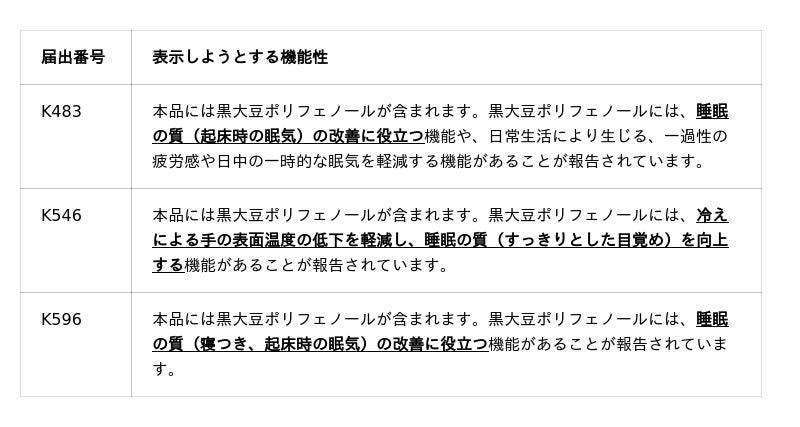 これまでに黒大豆ポリフェノールは「一過性の疲労感」や「日中の一時的な眠気」を軽減する機能性表示食品の届出が受理されており(届出番号:G840、H647、H777)、今回の「睡眠の質の改善」と「冷えの改善」と合わせることで、現代社会で暮らす人々の様々な悩みにアプローチできると考えられます。