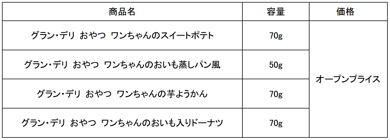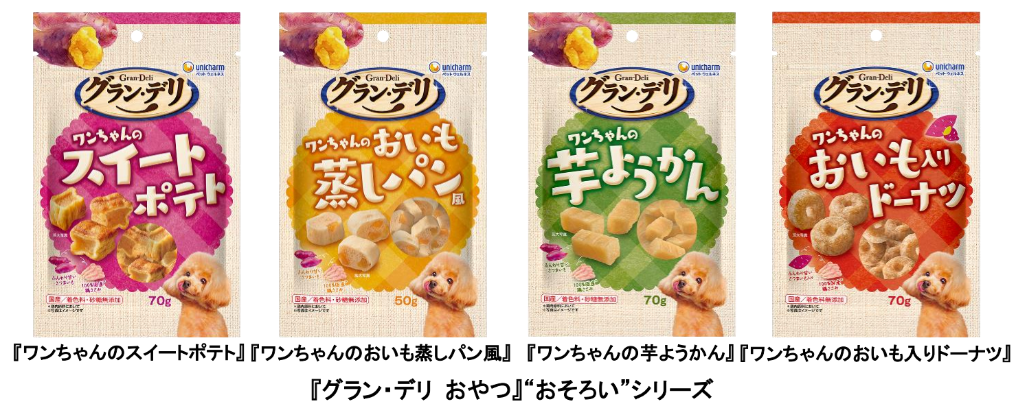 そこでこのたび、スイートポテトやドーナツといった人間の定番おやつの見た目を再現し、食感のバリエーションにもこだわったワンちゃん用『グラン・デリ おやつ』の“おそろい”シリーズを発売します。