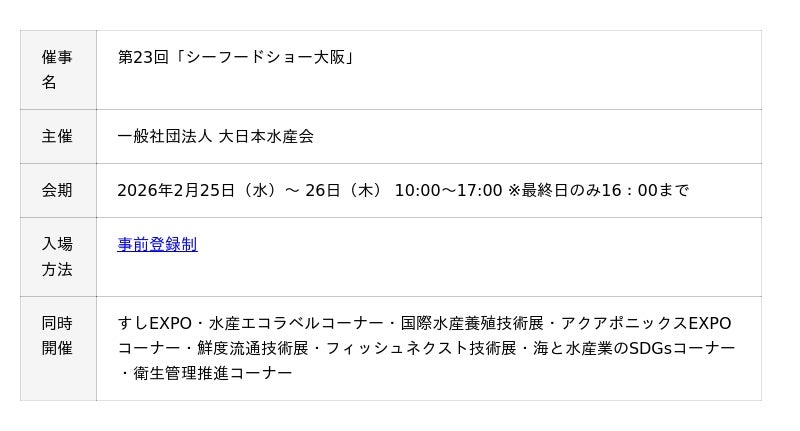 株式会社アイエンター(本社:東京都渋谷区、代表取締役:入江恭広、以下「アイエンター」)は、2026年2月25日(水)~26日(木)にATCホールで開催される「第23回シーフードショー大阪」に出展します。