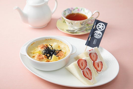 ポテトとたらこのドリア、苺のフルーツサンド、ソフトドリンク