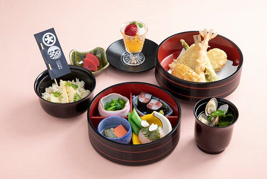 前菜(甲イカと鮪の市松造里、桜鯛てまり、菜の花辛子和え、二色生麩(蓬・桜)、 揚げ出汁)、天ぷら(なんば、海老、アスパラ、新じゃがいも、キス)、筍ご飯、浅利の吸い物、赤かぶ漬け、清美オレンジシャーベット 苺とホイップのせ