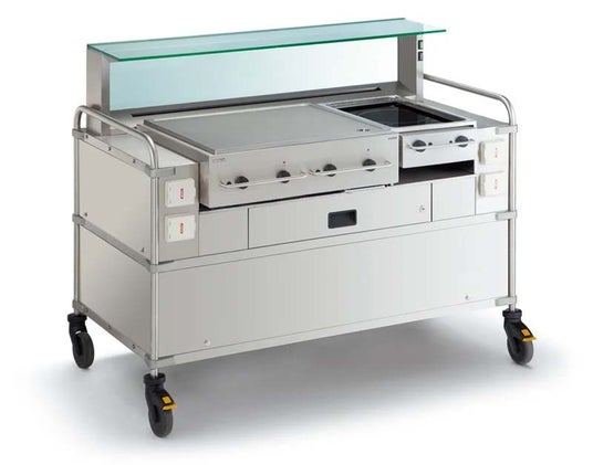 無煙調理ワゴン「アイスフィンク」のカセット式調理ユニットの組み替えで、さまざまなジャンルの料理演出が可能。