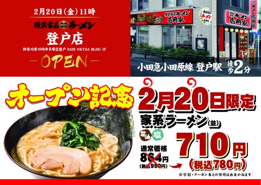 「壱角家 登戸店」は、小田急線・JR南武線が交差し、1日の平均乗客数は約23万人の「登戸駅」から徒歩2分という好立地に出店いたします。駅周辺には多くの大学や高校があり、地域住民や通勤客、ファミリー層など幅広い層の方が集まります。周辺にお住いの方や、部活動終わりの学生、お仕事帰りのサラリーマンの方など、日常の幅広いシーンで気軽にご利用いただけるよう、スタッフ一同心を込めて営業してまいります。