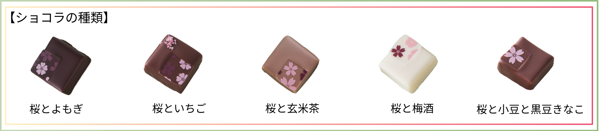 静岡県産の桜の葉を煮出して香りづけしたガナッシュをベースに、日本各地素材をペアリングし、ビジュアルだけでなく、味と香りで春を感じられるショコラに。
