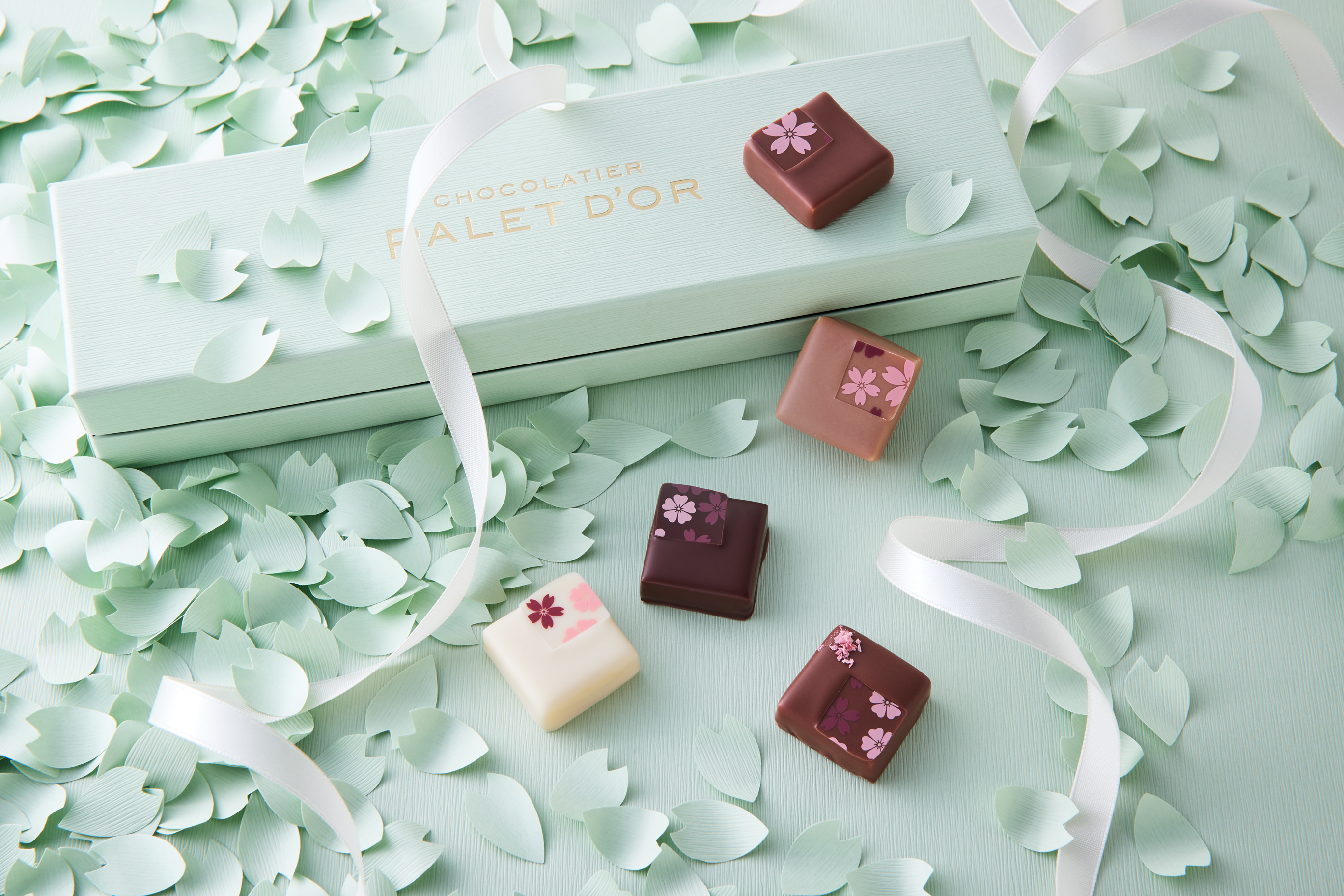 日本の春といえば「桜」。純白のリボンをほどき、ペールグリーンのBOXを開いた瞬間に桜葉の香りがふわりと広がるショコラに、春の陽ざしにほころぶ桜の花をデザインしました。