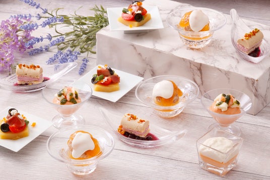 そのほか、雲丹のフランや、北海道産シーフードのブイヤベース、知床サーモンのパイ包み焼きなど、海の恵みを存分に味わえる多彩なメニューをラインナップ。濃厚な旨味が魅力の北海道産牛肉のローストビーフは、ご注文ごとにシェフが切り分けて提供いたします。さらに、北海道産赤肉メロンやハスカップ、天地人トマト、冬熟じゃがいもなど選りすぐりの食材を使用した料理もご用意し、北海道の大地の恵みもお楽しみいただけます。