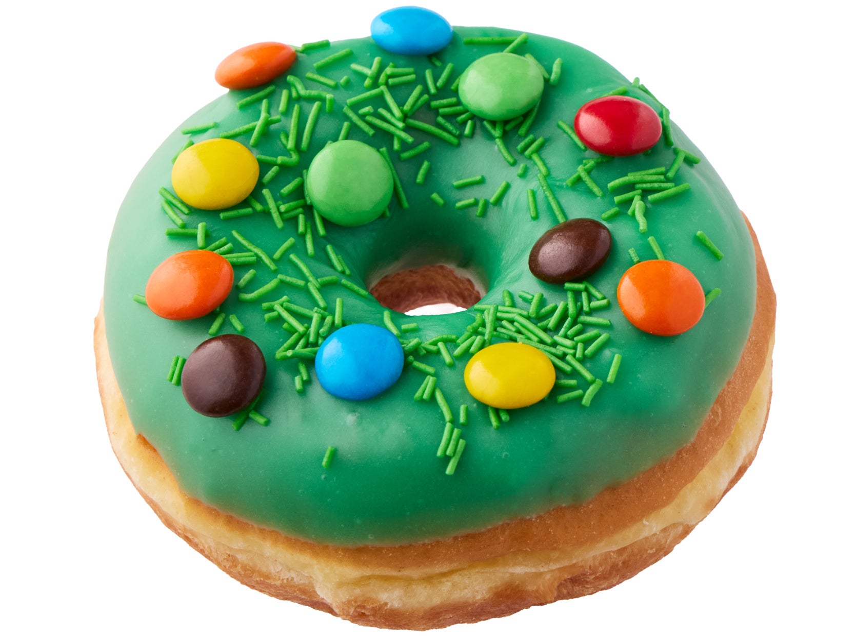 鮮やかなグリーンのアイシングに、グリーンのスプリンクルとチョコレートキャンディをトッピングしました。ポップでカラフルな色合いが特徴的なドーナツです。