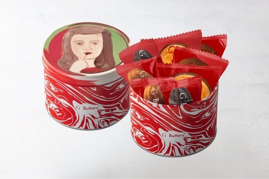 Gバターズの「ガレット」、「フィナンシェ」の全種類を、オリジナルの缶に詰め合わせました。「Gバターズ ガレット デュオ」、「Gバターズ ガレット ショコラ」、そして「Gバターズ フィナンシェ アンバー」、「Gバターズ フィナンシェ ノワール」がそれぞれ2個ずつ入っています。華やかな色味の缶は、Gバターズを象徴する女の子の絵をあしらいました。紅白の明るい色味に、不思議な雰囲気のデザインが、魅惑的なGバターズの世界観を表します。