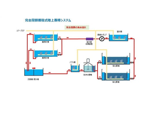 人工海水を循環利用する完全閉鎖循環式陸上養殖システムの構成イメージです。