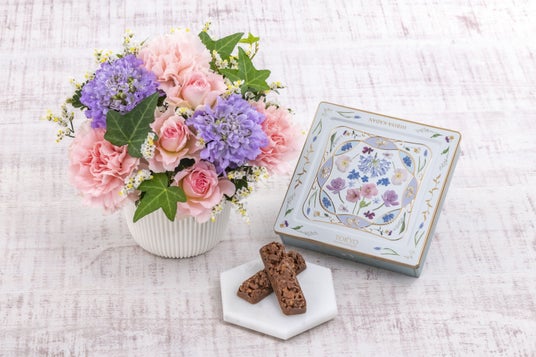 日比谷花壇オンラインショップでは、新作パッケージの登場に合わせ、春のギフトにふさわしい「花柄缶(洋菓子)」と「生花アレンジメント」を組み合わせた限定セットを販売します。花柄のデザインから着想を得て、フローリストが旬の生花をセレクトしました。パッケージに描かれた春の花々と手元で鮮やかに咲く生花が共演する、花屋さんならではの特別なギフトセットを2月19日(木)より先行して受注開始します。