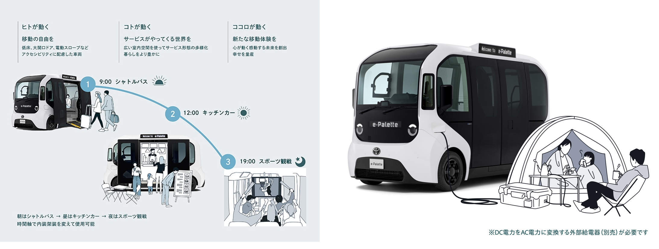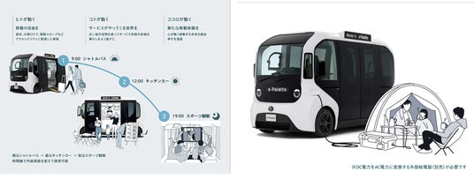 e-Paletteは、広い室内空間や大型ウインドウガラスによる開放感を活かして、人々の移動手段にとどまらず移動する店舗やサービス空間など、一台のクルマを使ってさまざまなモビリティサービスに対応可能なモビリティです。広い車内空間を活かし、人の移動だけでなく、移動販売やサービス提供など多様な用途に対応できる設計となっており、地域や利用シーンに応じて柔軟な活用が可能です。また、EVとして走行時にCO2や排気ガスを排出せず、給電機能を備えていることから、平時の移動に加え、災害時の非常用電源としての活用も期待されています。