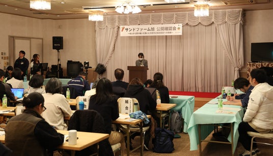 サンドファーム旭は、砂地土壌の地域特性を生かしたハウス栽培で、化学合成農薬や化学肥料の使用量を削減したミニトマトやキュウリなどを生産する産地です。公開確認会の冒頭では、取締役を務める斉藤雅通さんが、やりがいある農業による安全な農作物生産と後継者育成の理念や栽培における工夫を説明しました。