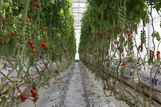 ミニトマト栽培の現場では、近年の猛暑の影響を軽減するため高さ5.5mのハウスを導入し、3重ビニールやUVカットフィルムで高温障害を防いでいます。一株毎の日当たりを良くするため、ワイヤー吊りで栽培し、約1年間にわたる長期収穫を実現しています。